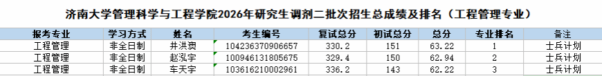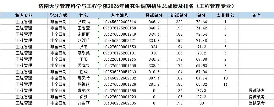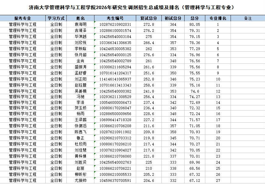 根据《济南大学2026年硕士研究生调剂公告》《管理科学与工程太阳城集团 2026年硕士研究生调剂办法》的相关要求和部署,管理科学与工程太阳城集团 2026年硕士研究生招生调剂批次复试工作已圆满结束。现将调剂考生成绩予以公示。